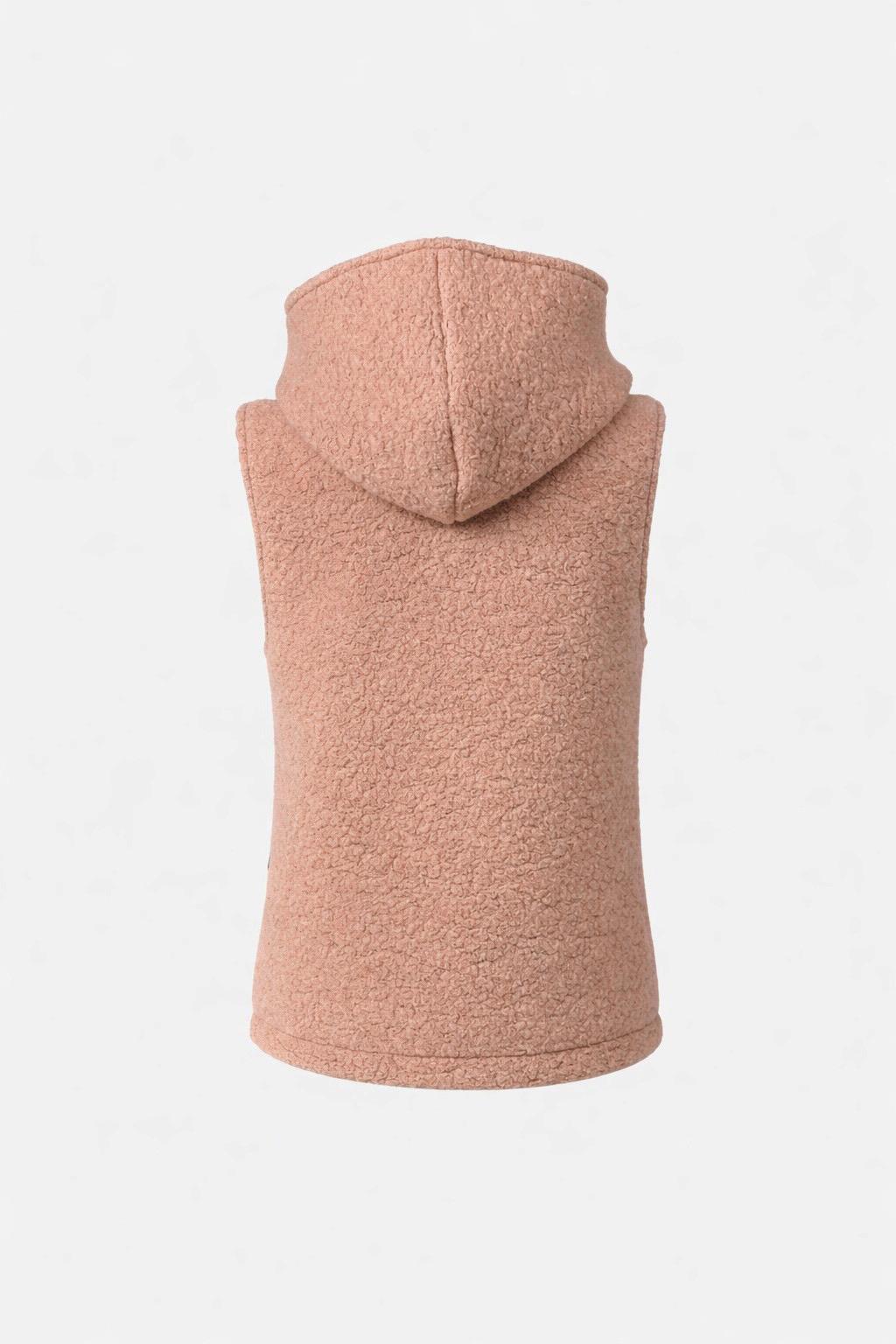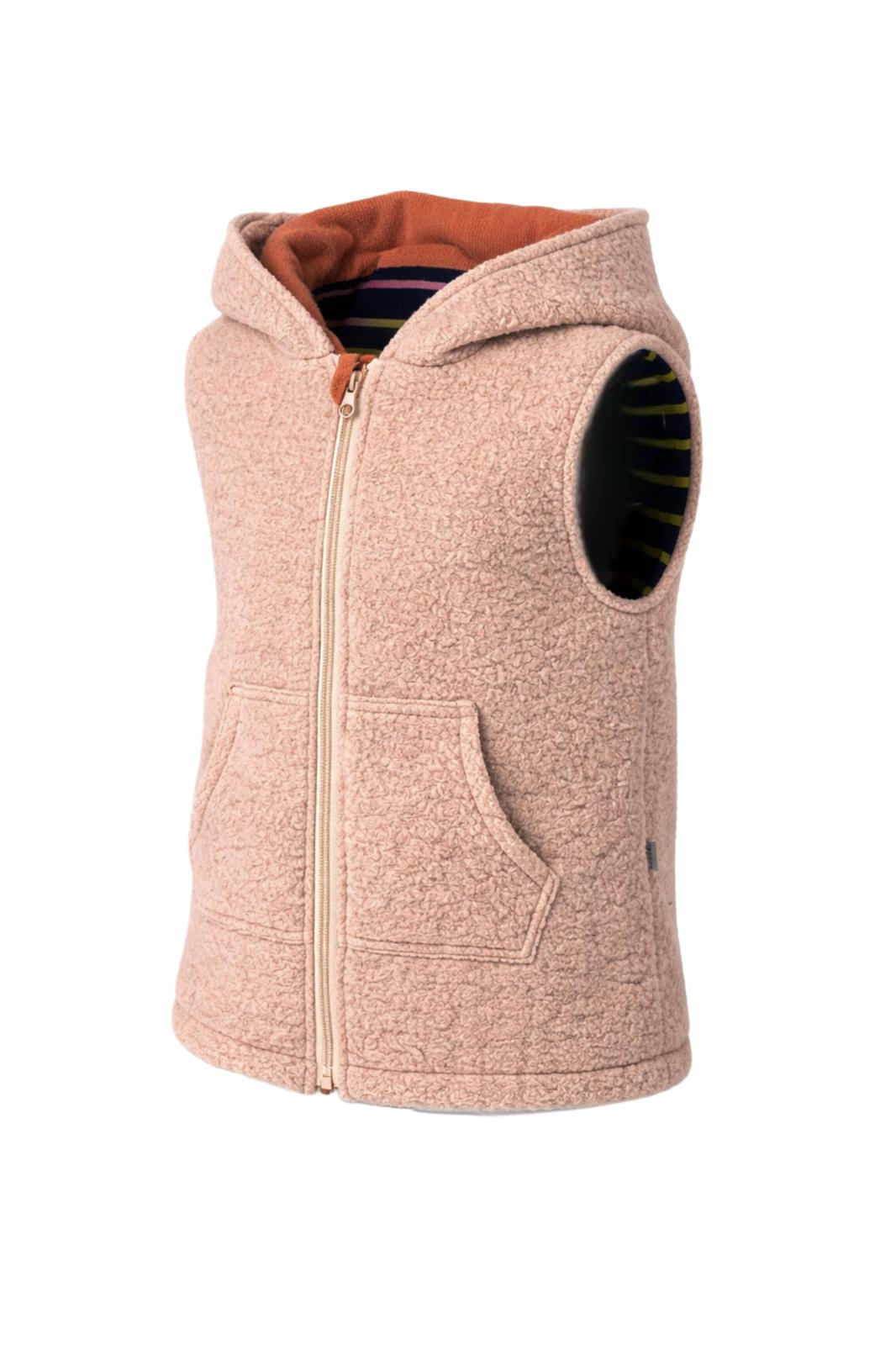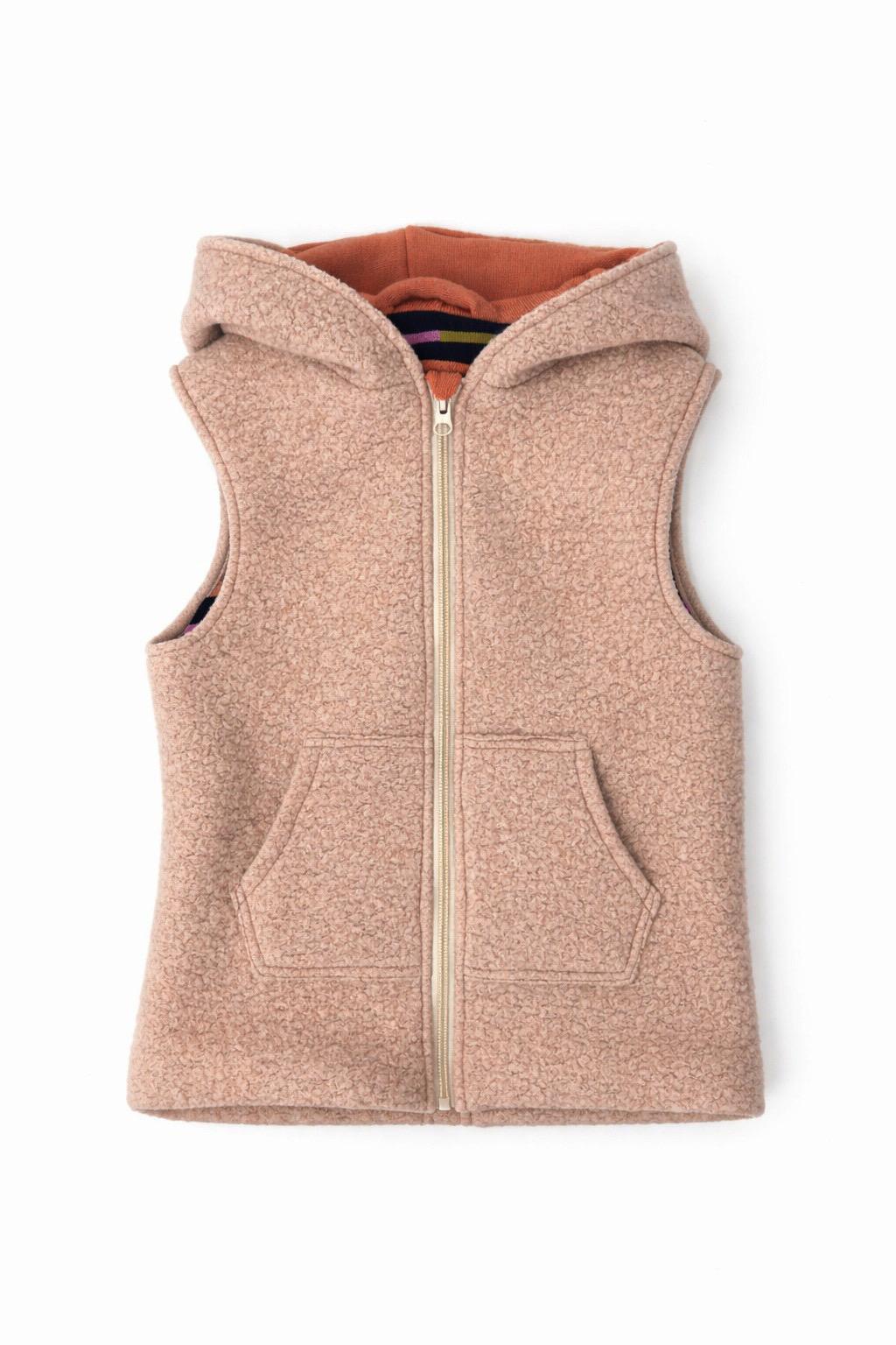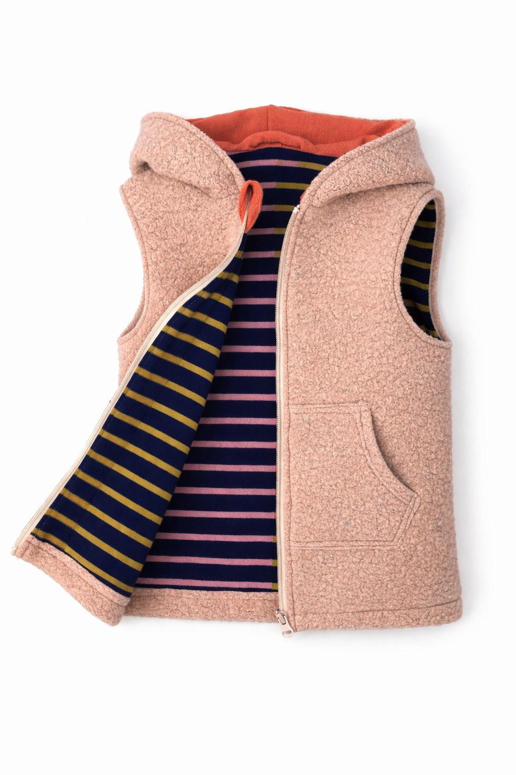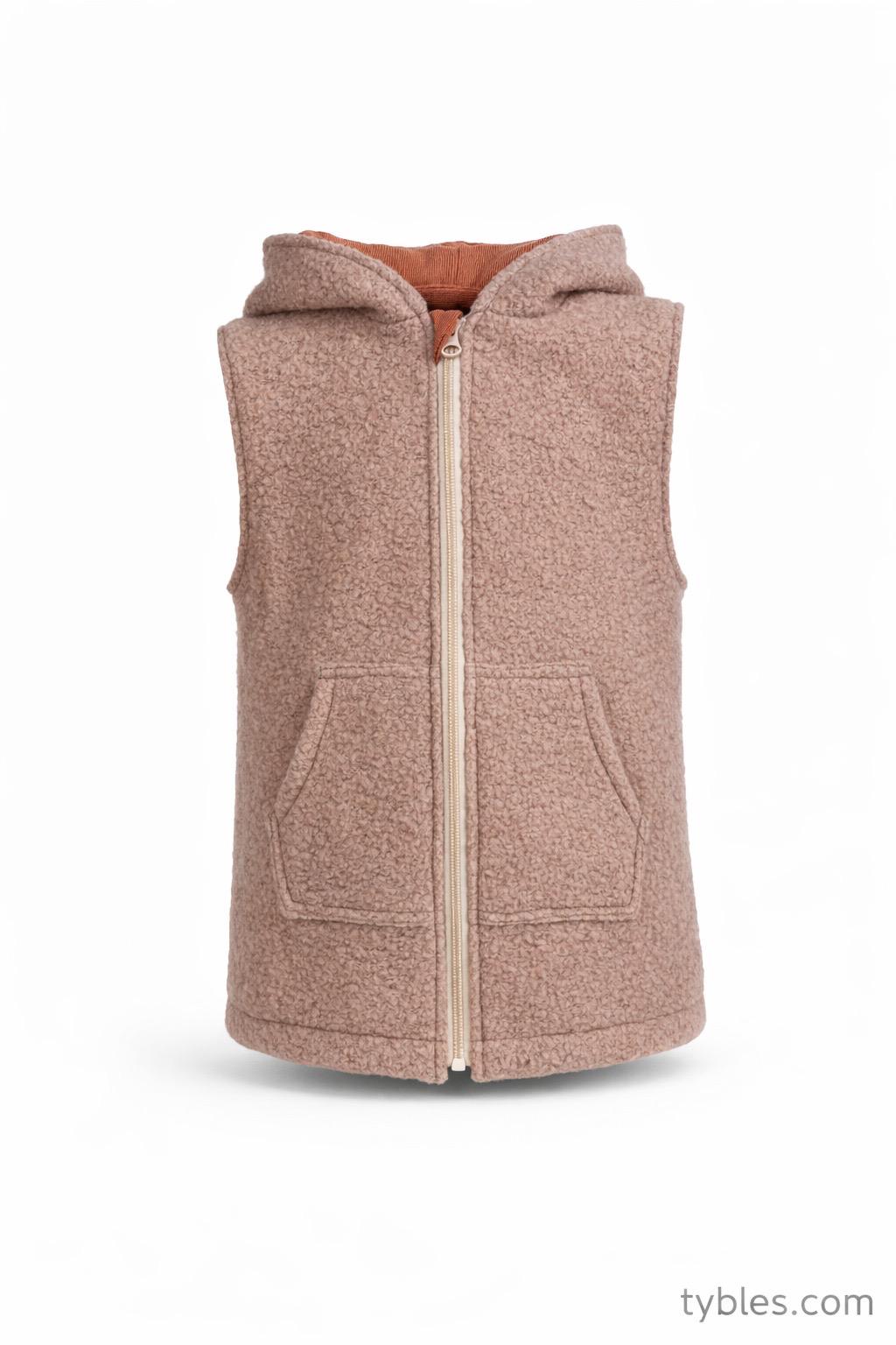 Przedmiotem aukcji jest dwuwarstwowy dłuższy bezrękawnik dziecięcy w rozmiarze 104 cm, wykonany w duchu zero waste z wysokiej jakości wełny, pranej i prasowanej przed szyciem.