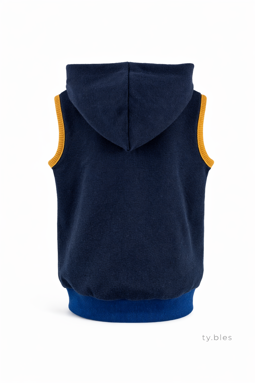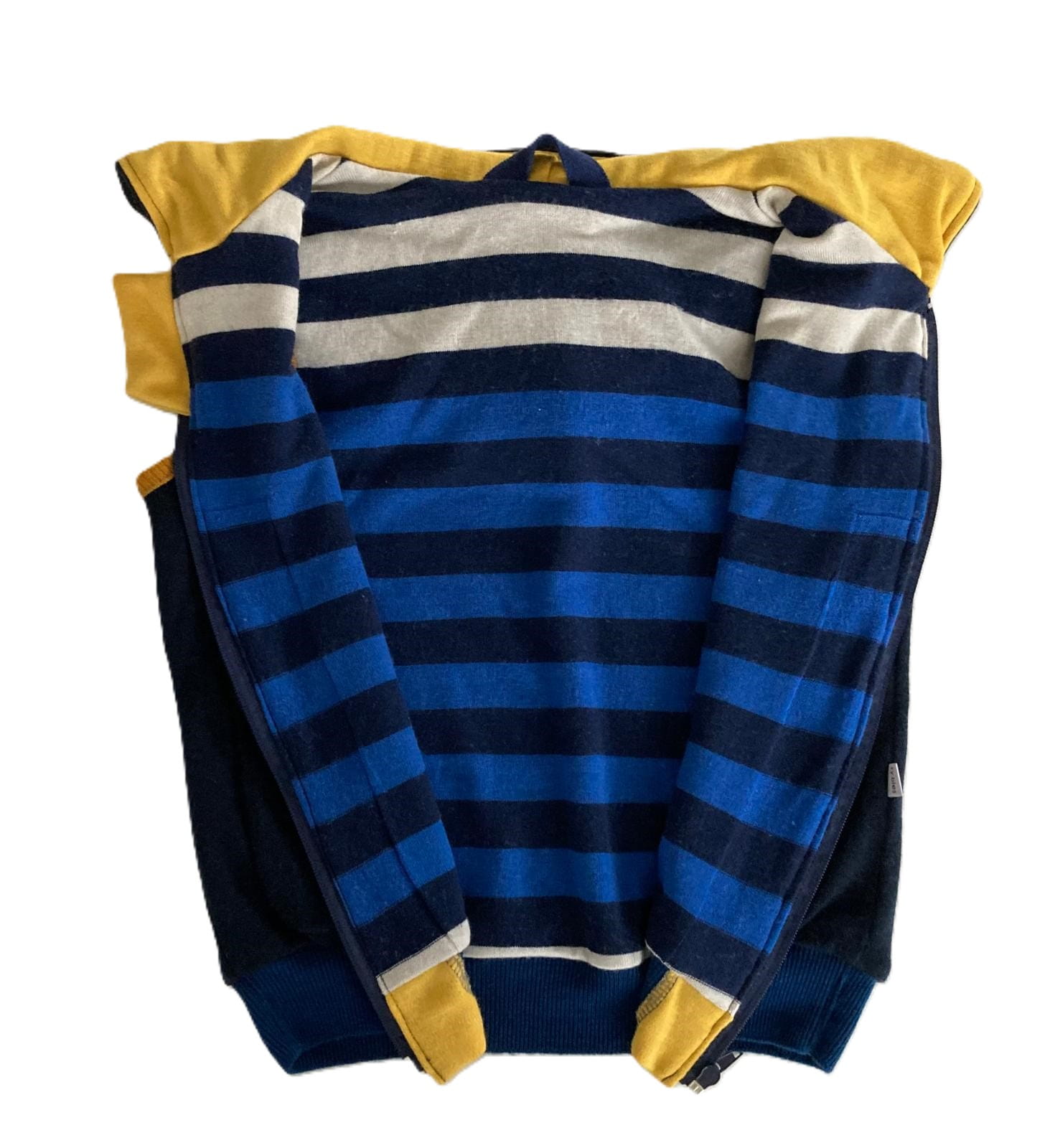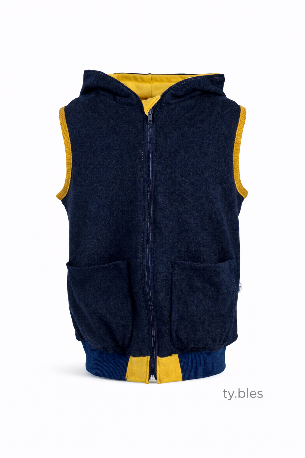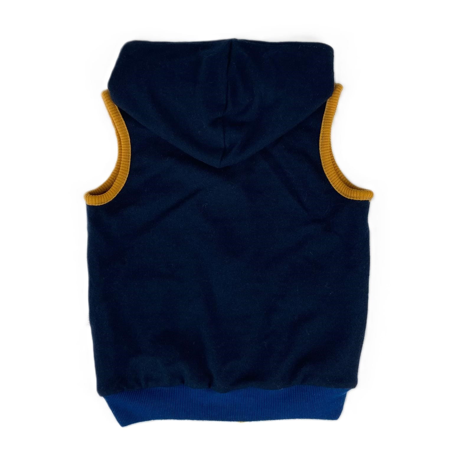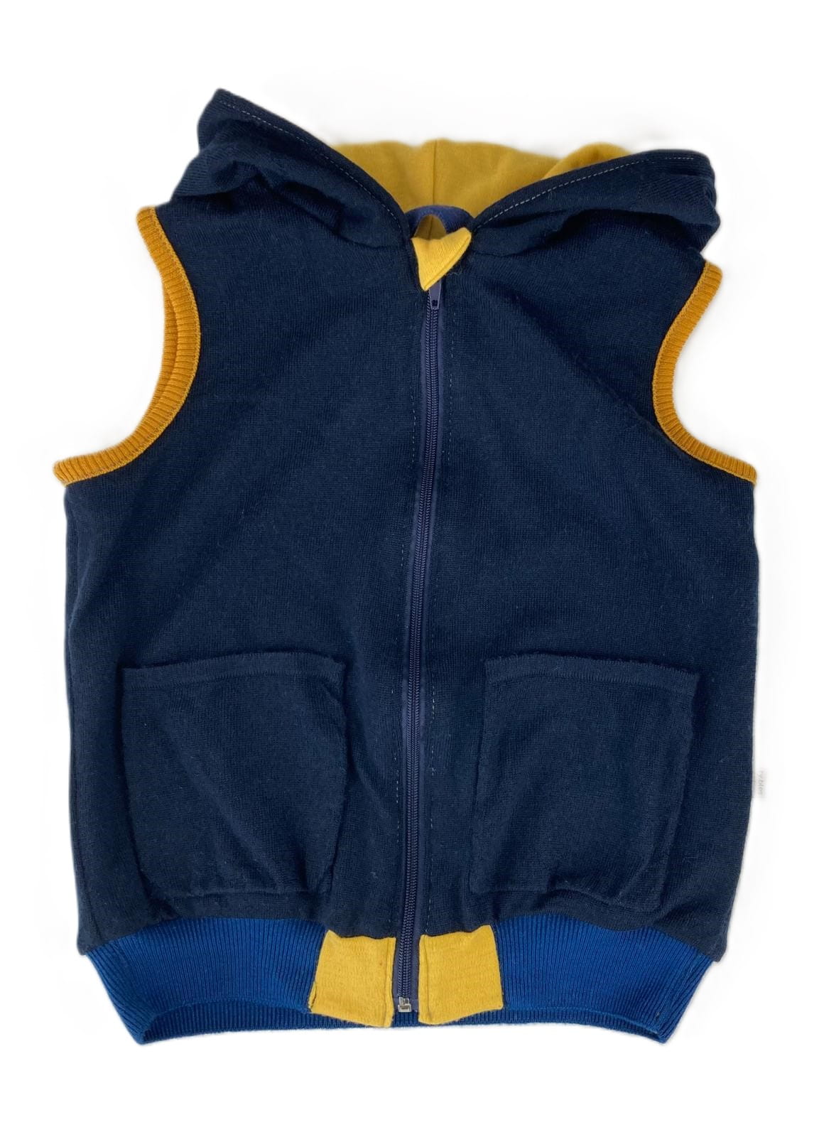 Dwuwarstwowy bezrękawnik dziecięcy w rozmiarze 122 cm, wykonany w duchu zero waste z wysokiej jakości używanej wełny, pranej i prasowanej przed szyciem.