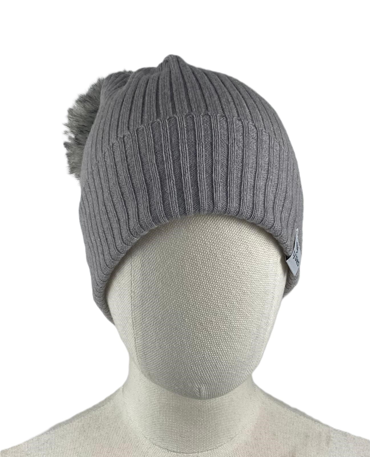 Jednowarstwowa wełniana czapka z szarym pomponem uszyta w duchu zero waste z używanej wełny