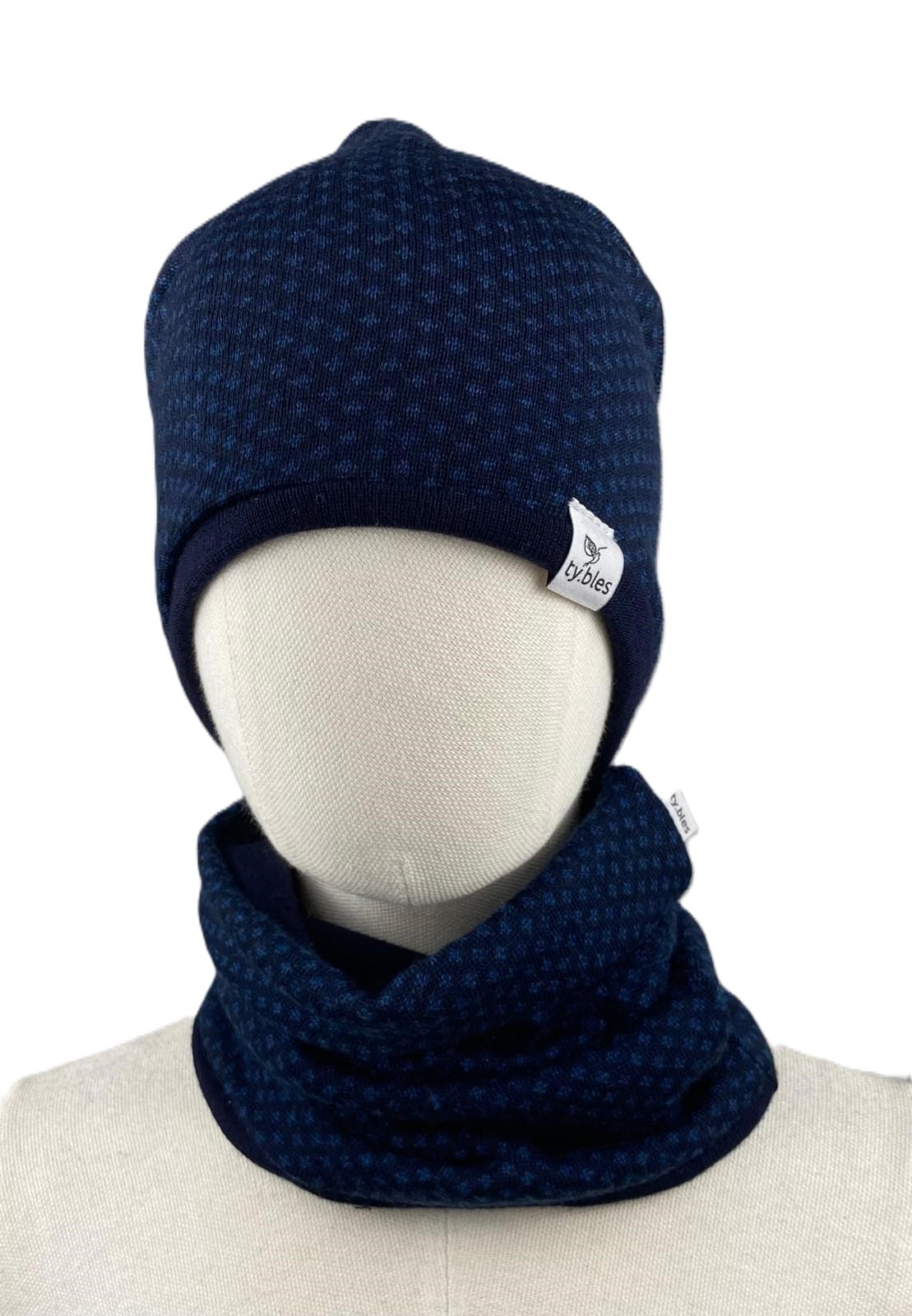 Stylowy zestaw, w skład zestawu wchodzi dwuwarstwowa niebieska czapka wełniana plus komin, uszyty w 100% z najwyższej jakości wełny pochodzącej z recyklingu. Materiał pochodzi z używanych swetrów, które są starannie prane i przygotowywane przed szyciem, co pozwala na nadanie im nowego życia i ograniczenie odpadów. Wszystkie nasze produkty są szyte w Polsce, z troską o najwyższą jakość i dbałością o środowisko.