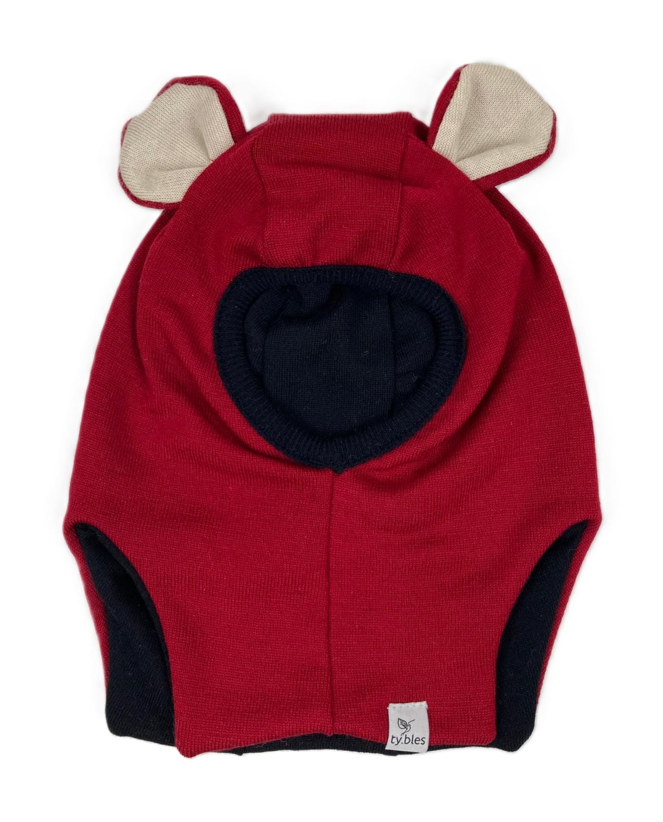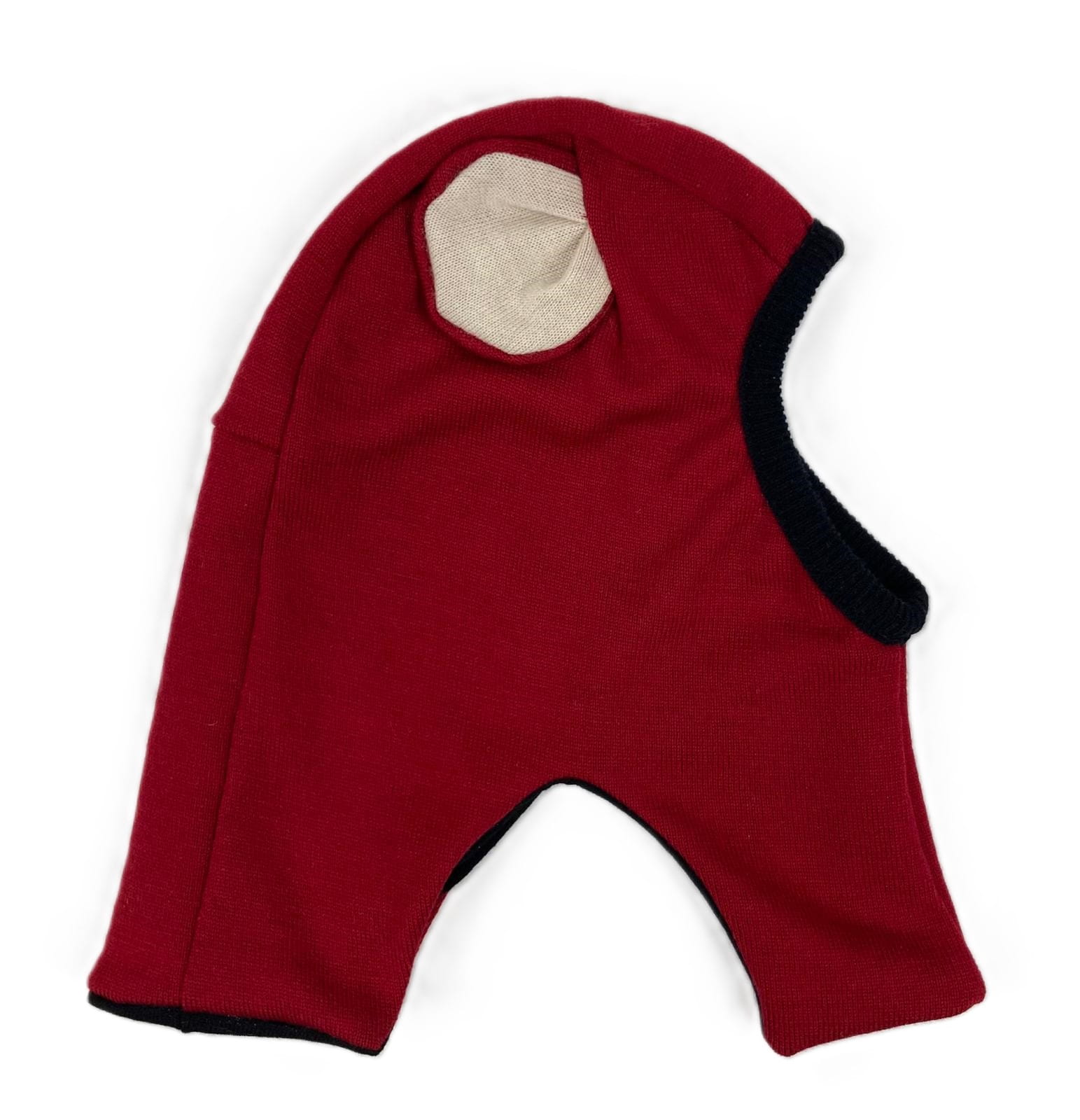 Dwuwarstwowa wełniana czapka kominiarka, w czerwonym kolorze, przeznaczona dla dzieci w wieku 2 - 4 lata. Produkt został wykonany w duchu zero waste z używanych swetrów wełnianych, co sprawia, że jest nie tylko ekologiczny, ale również doskonały jakościowo. Czapka zapewnia idealną ochronę przed zimnem oraz komfort termiczny w cieplejsze dni, a jej naturalne właściwości wspierają zdrowie skóry.