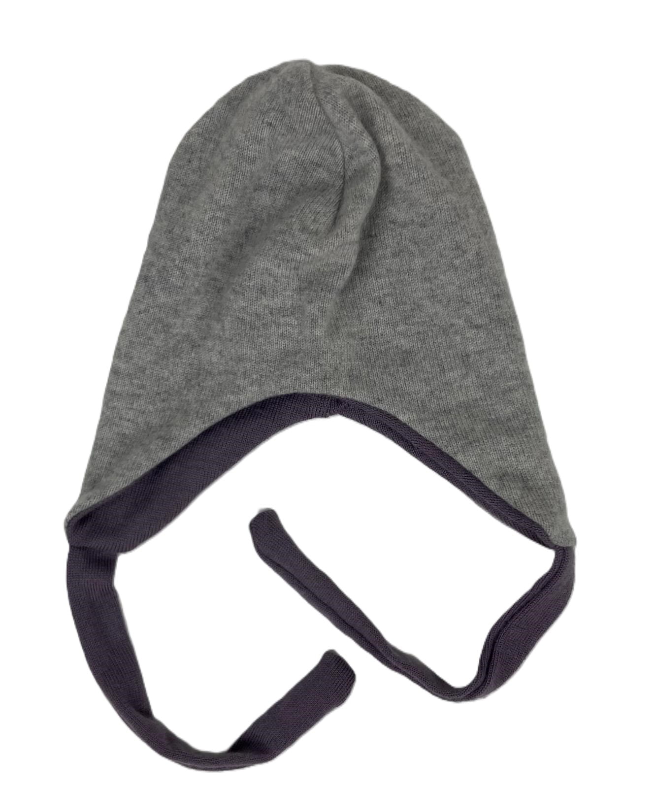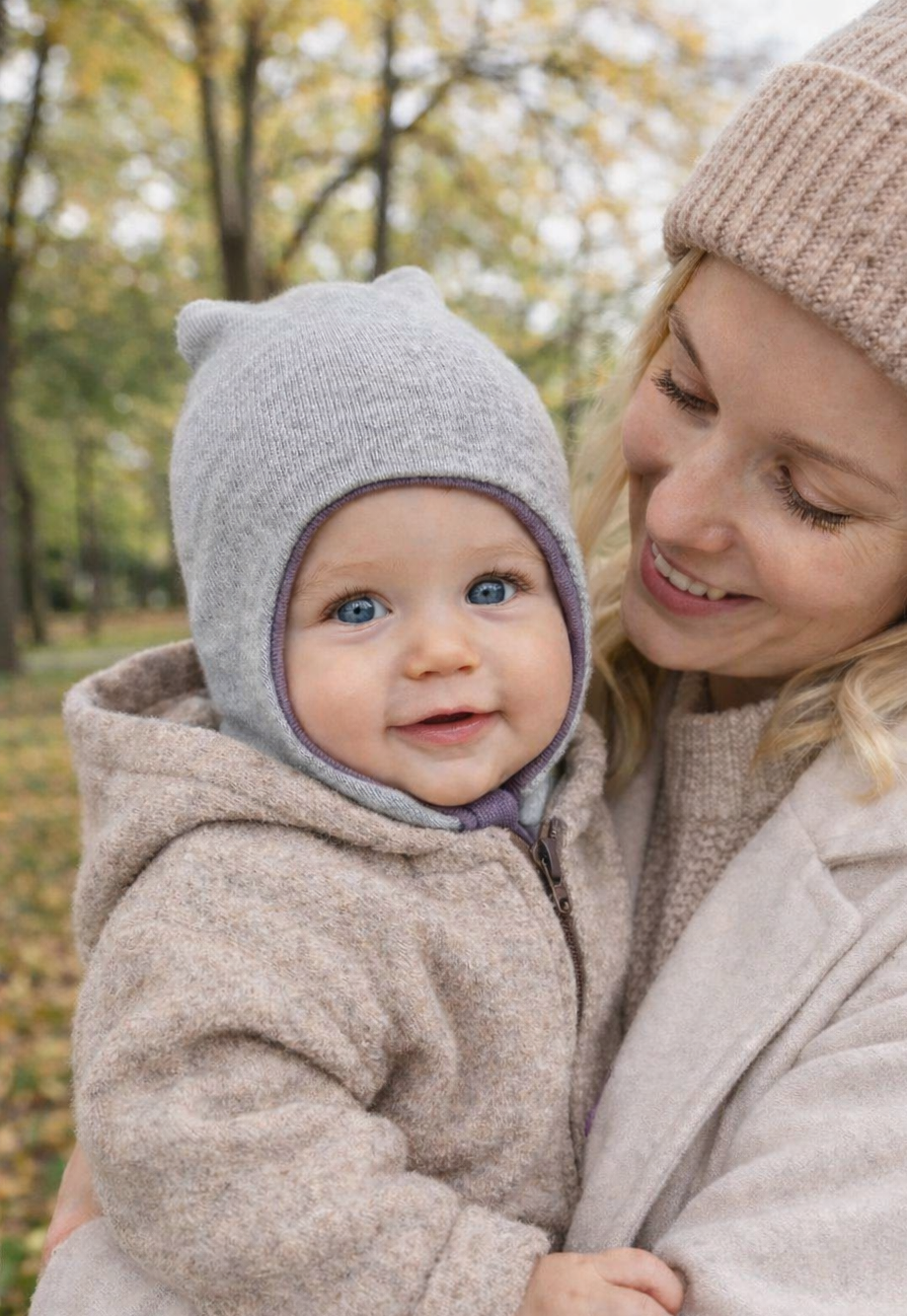 Oferujemy dwuwarstwową, delikatną czapeczkę wełnianą szara uszytą w 100% z naturalnych materiałów. Czapeczka została zaprojektowana z myślą o komforcie dziecka, gwarantując skuteczną ochronę przed chłodem oraz dopasowanie dzięki troczkom. Wykorzystanie używanej wełny zapewnia unikalny, ekologiczny produkt, który wpisuje się w ideę zrównoważonej mody. Rozmiar 74/80 cm. Kolor szary, środek fioletowy