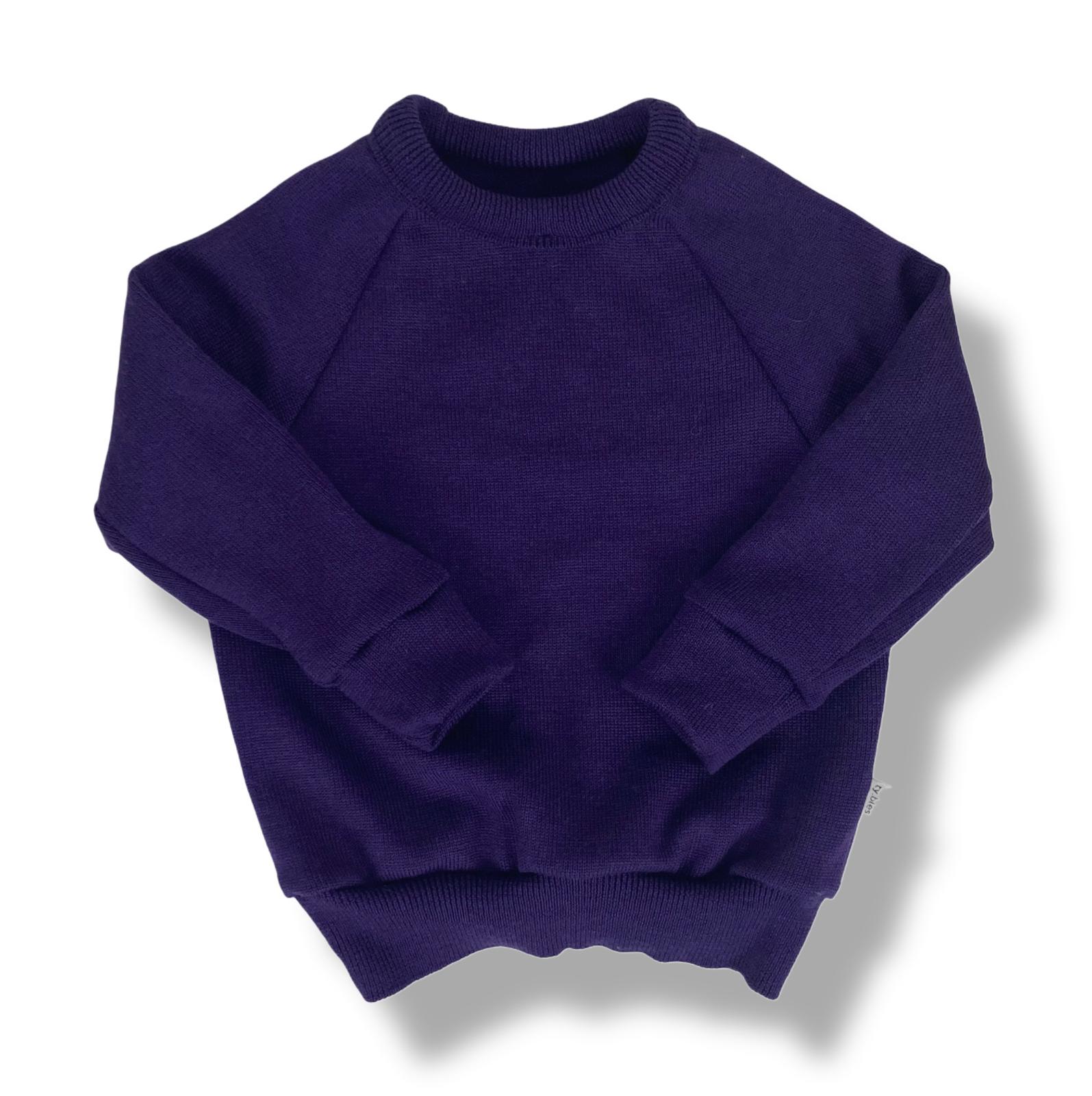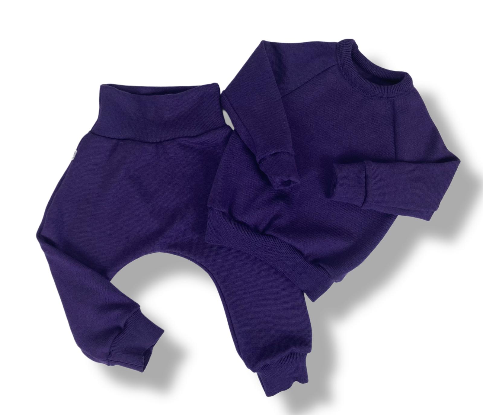 Naturalny, ciepły i wyjątkowy dres w kolorze fioletowym uszyty w duchu zero waste z używanych swetrów 100% merino.