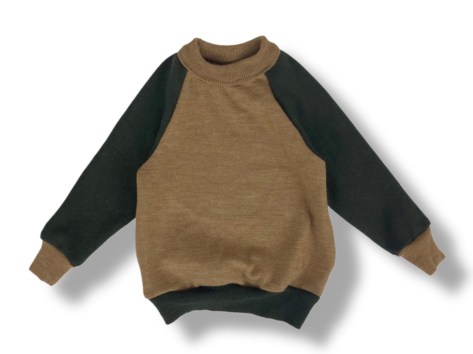 Naturalny, ciepły i wyjątkowy dres w kolorze zielono beżowym uszyty w duchu zero waste z używanych swetrów 100% merino.