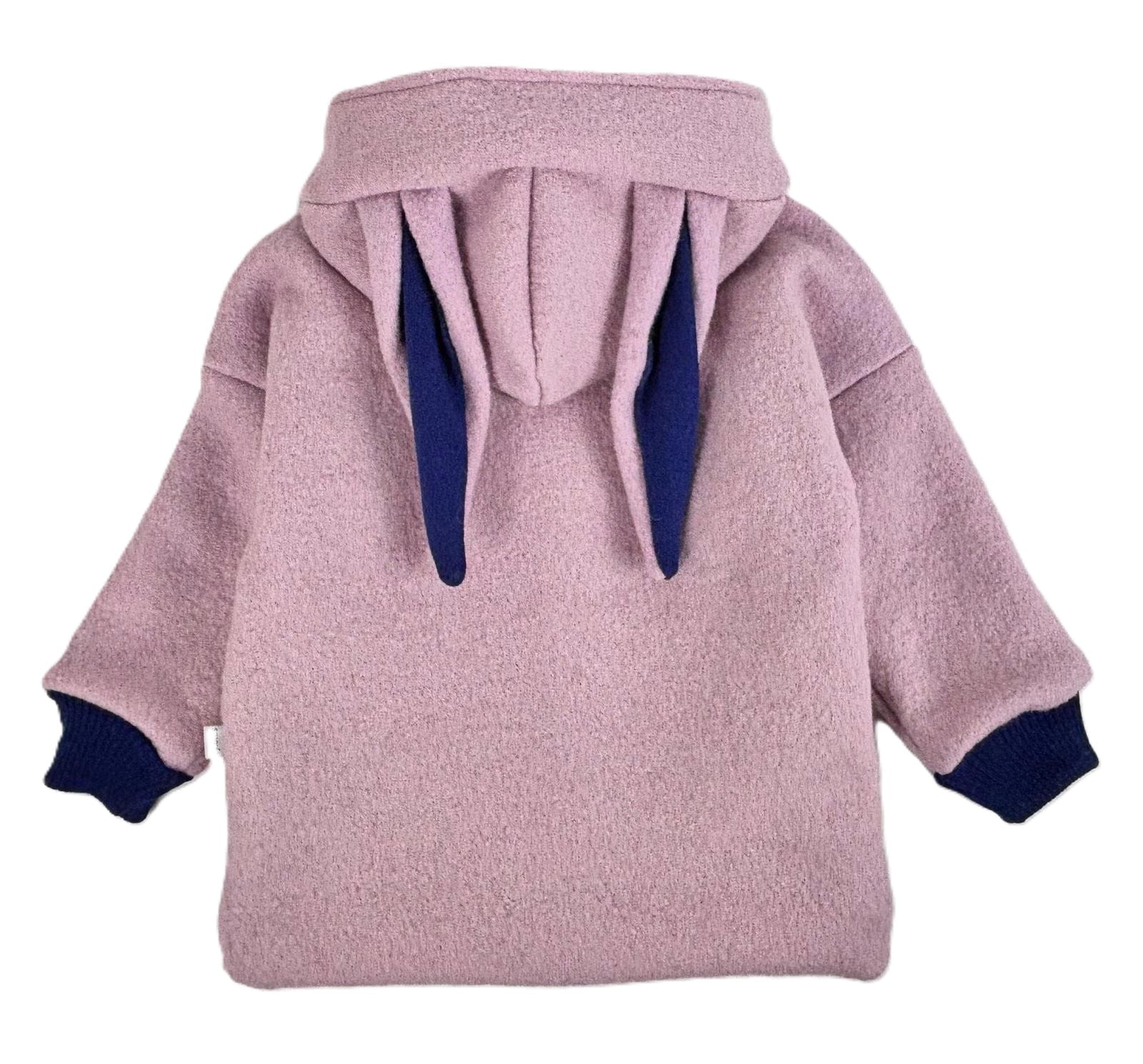 Wnętrze kaptura i rękawów oraz mankiety uszyte są z używanej wełny pranej przed szyciem w kolorze kobaltowym.