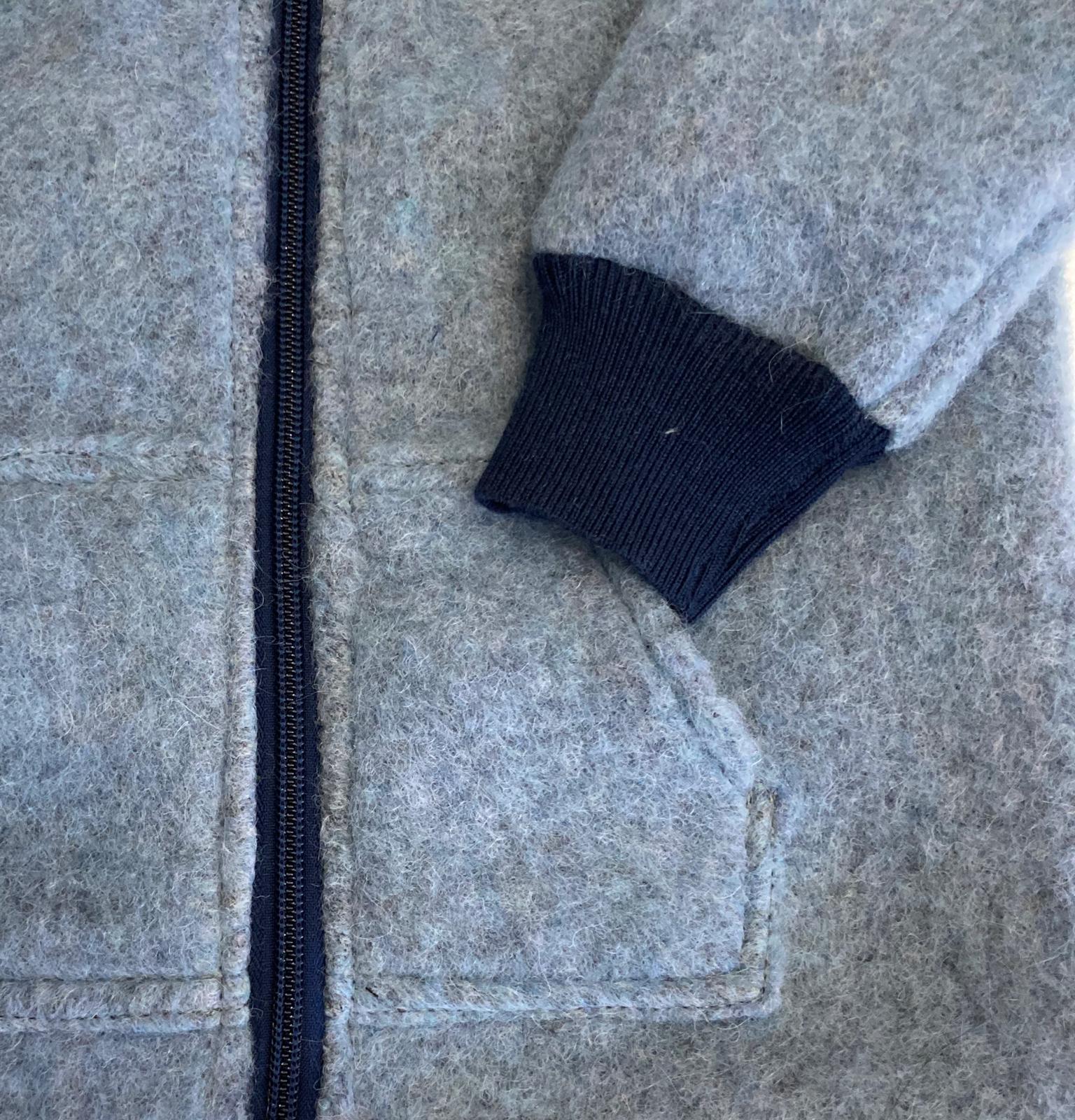 Mankiety i wnętrze kaptura uszyte są z granatowego merino z recyklingu pochodzące z używanych swetrów