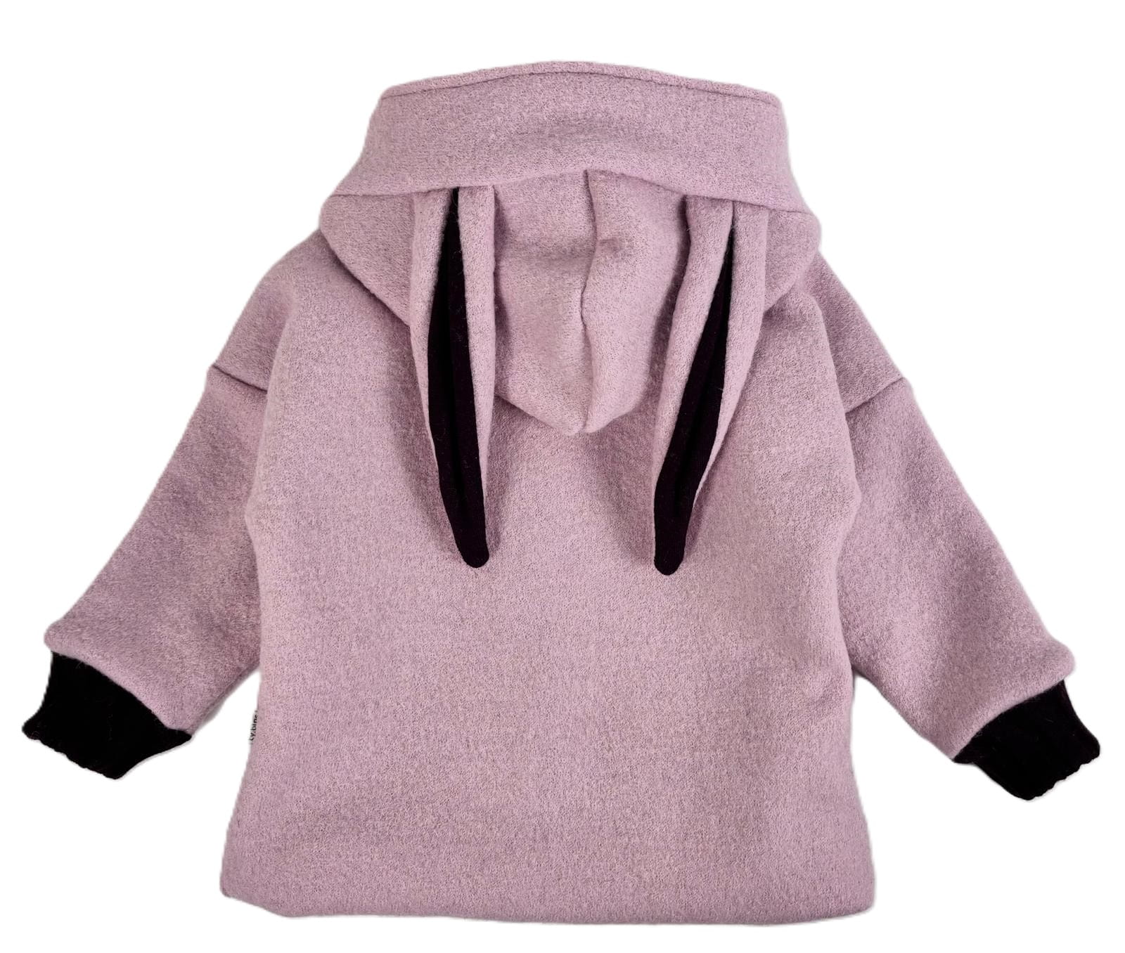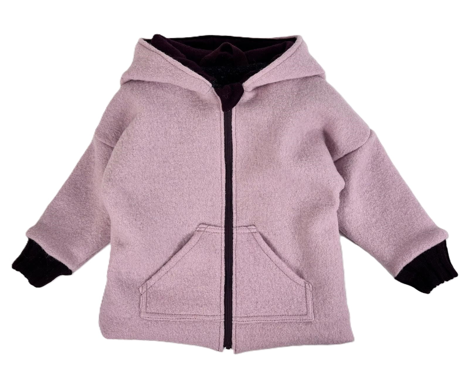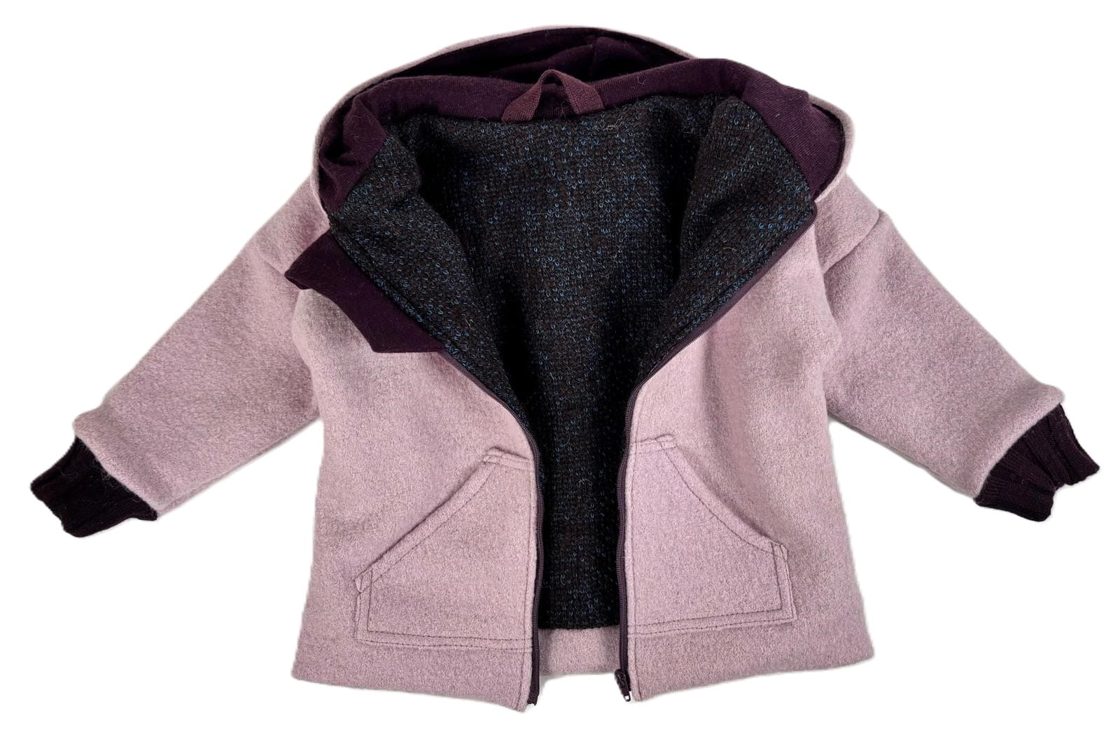 Dwuwarstwowa kurtka wełniana z kapturem w rozmiarze 86 cm, która idealnie łączy styl, komfort i troskę o środowisko.