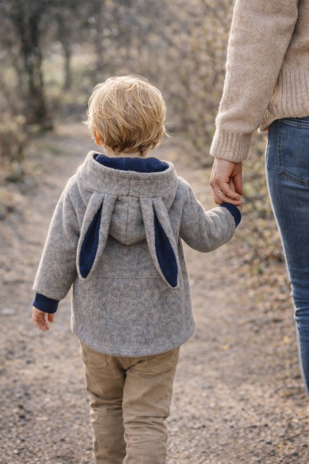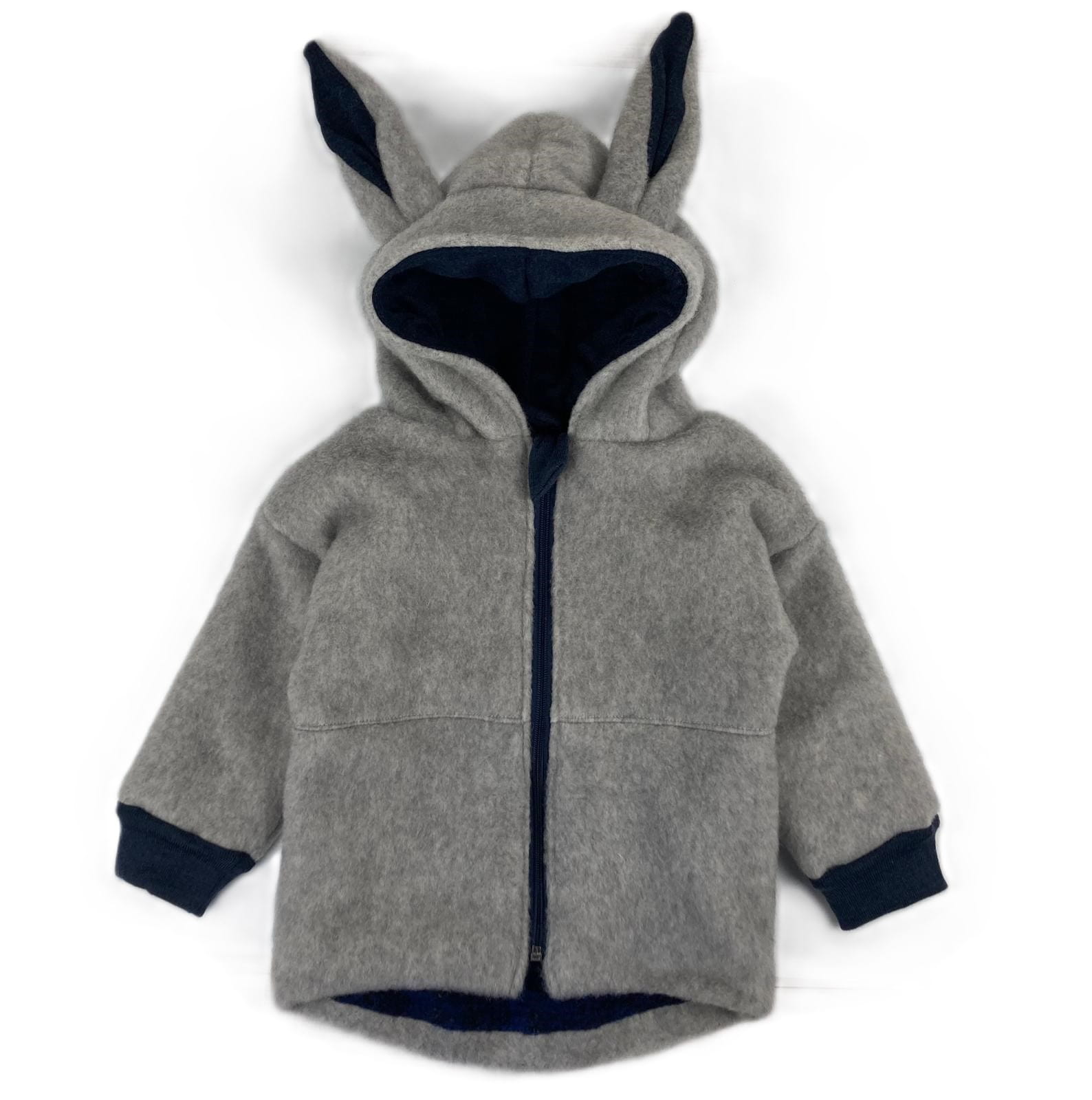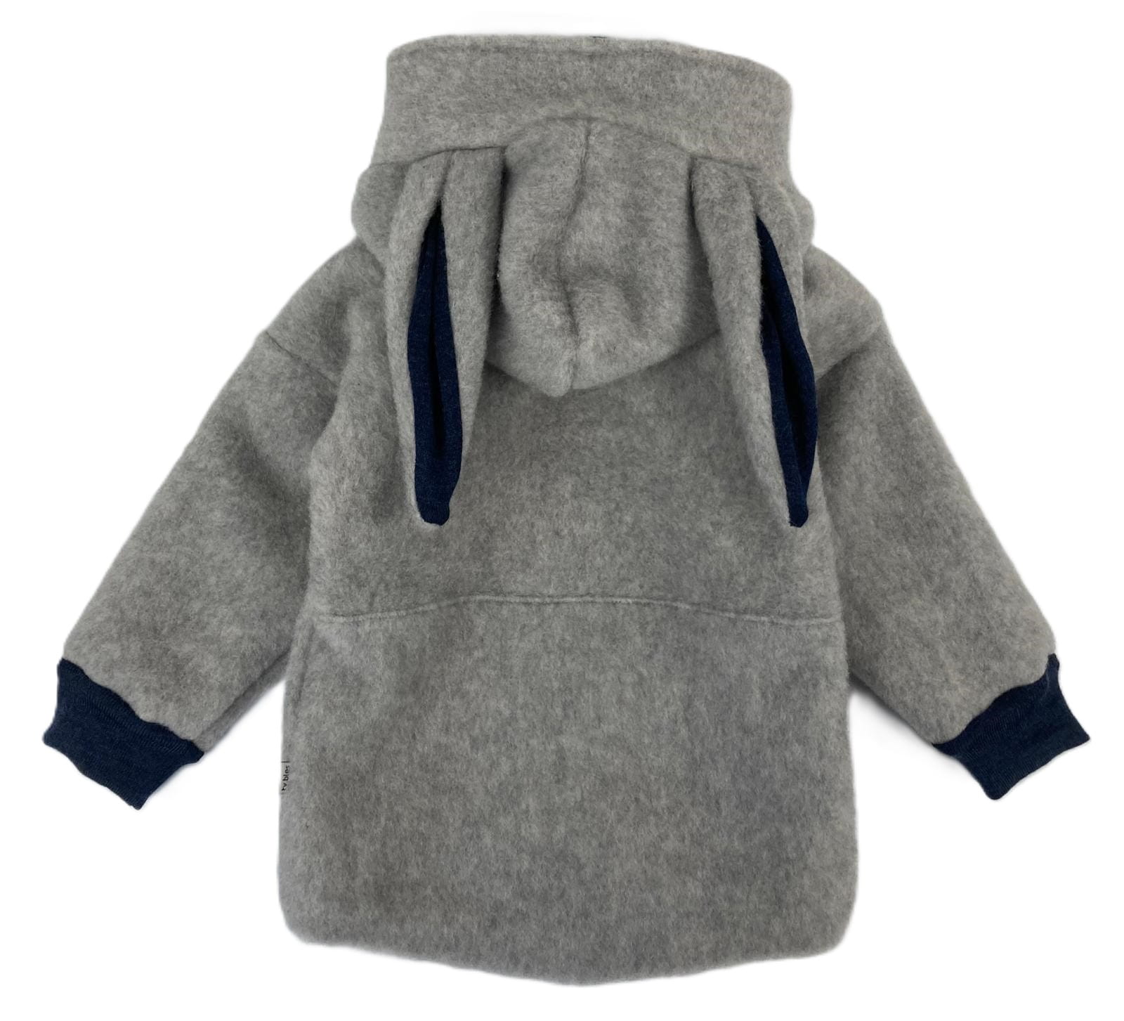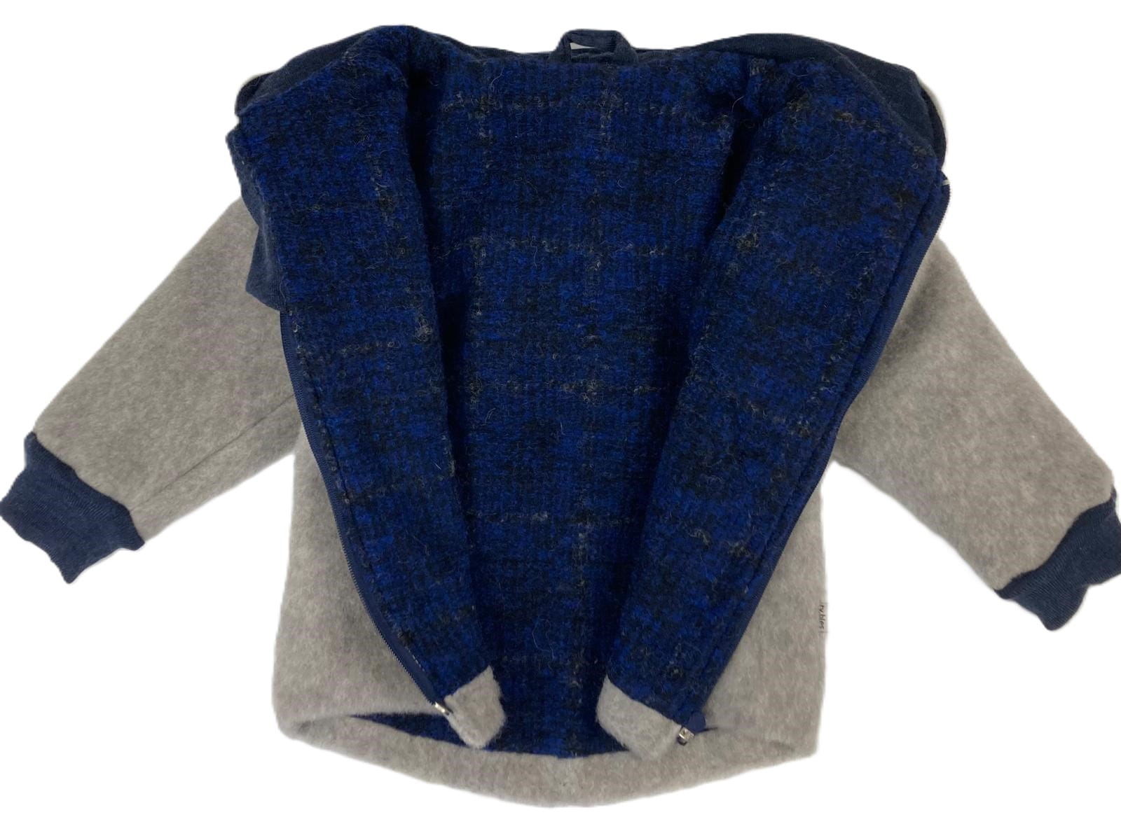 Dwuwarstwowa kurtka wełniana z kapturem w rozmiarze 86 cm, która idealnie łączy styl, komfort i troskę o środowisko.