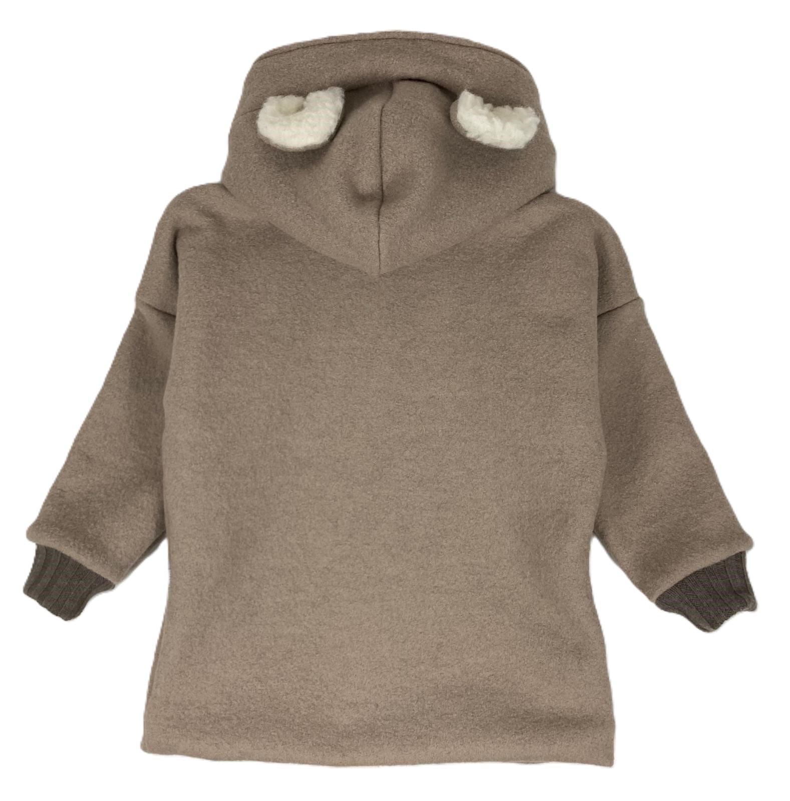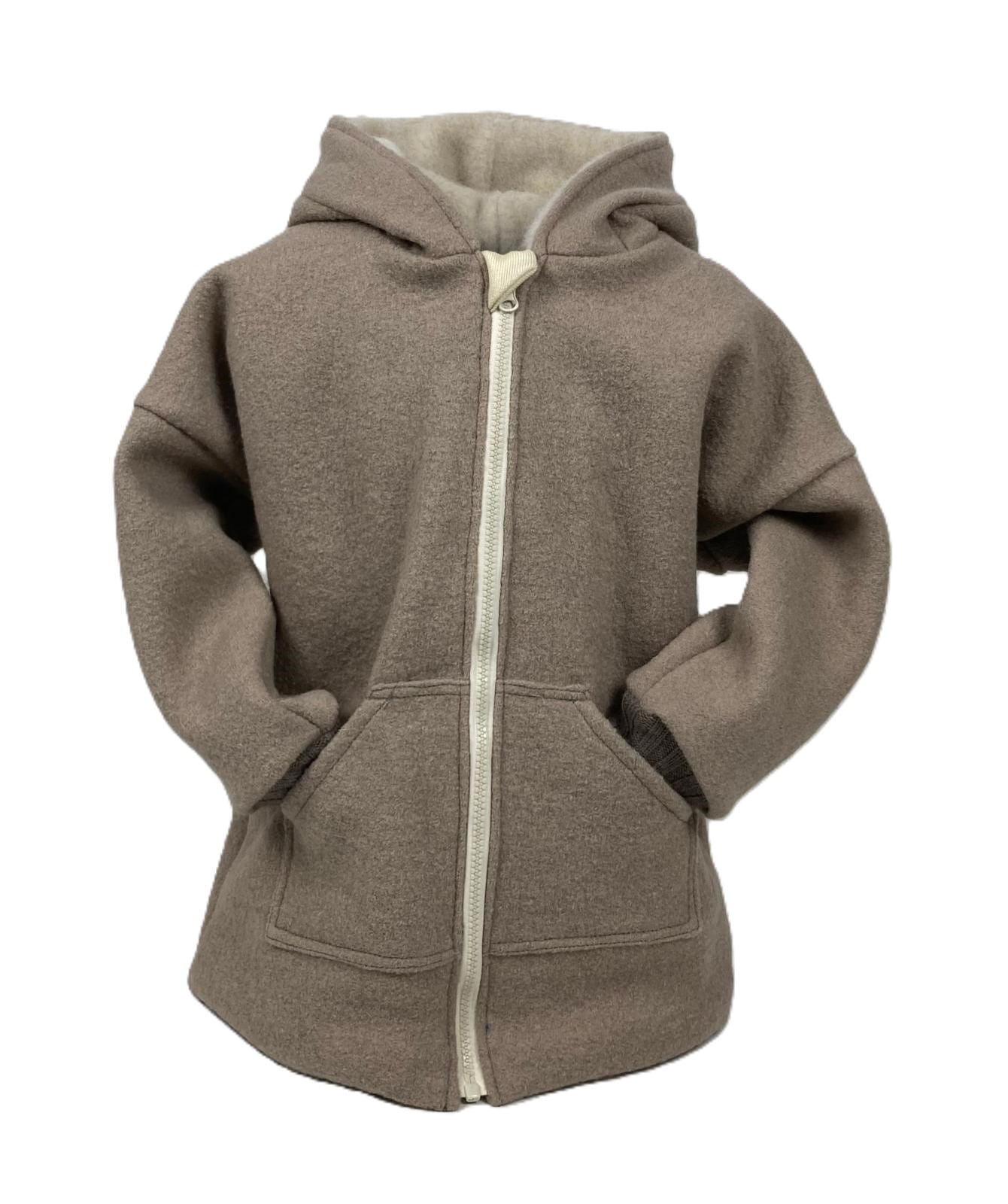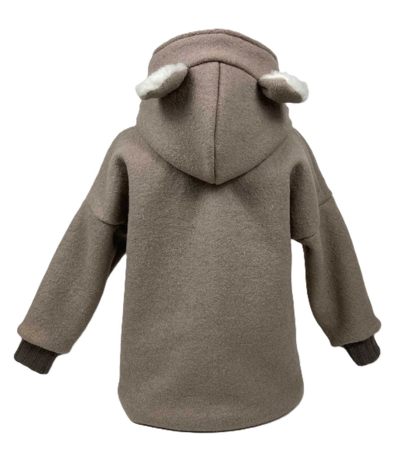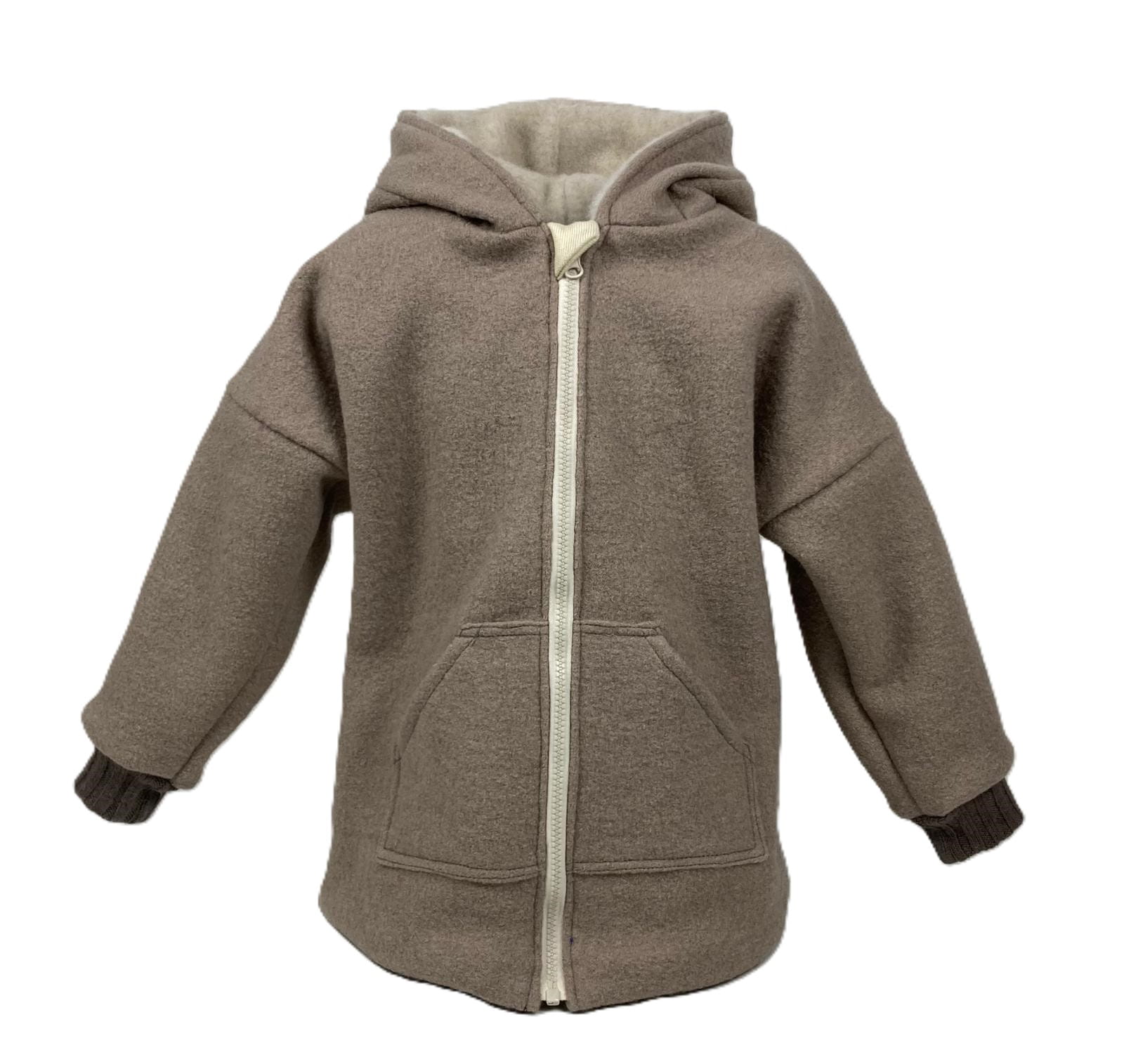 Dwuwarstwowa kurtka wełniana z kapturem w rozmiarze 116 cm, która idealnie łączy styl, komfort i troskę o środowisko.