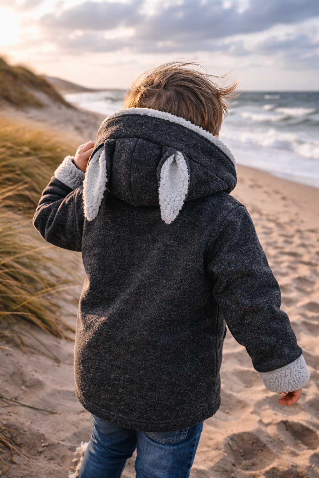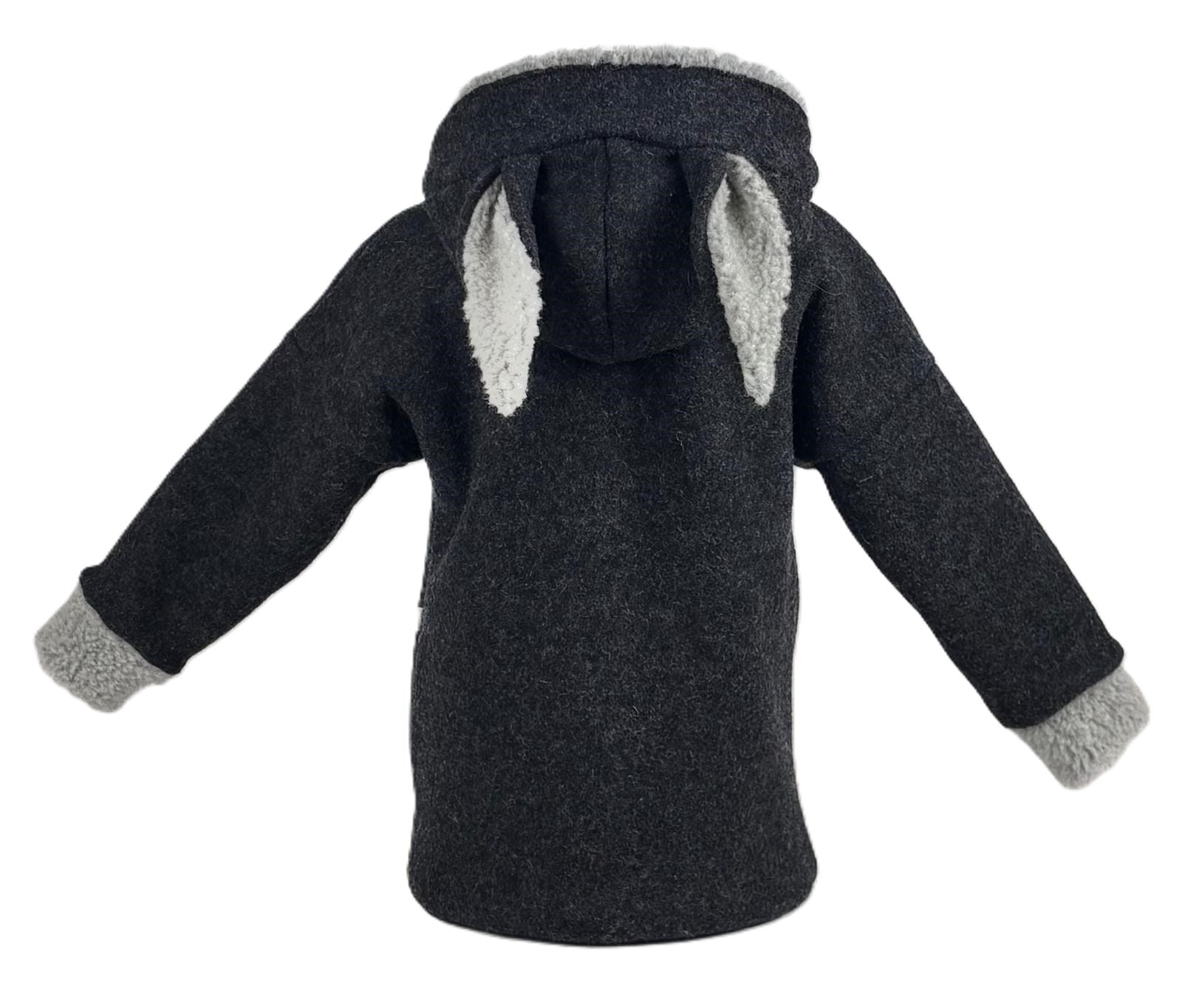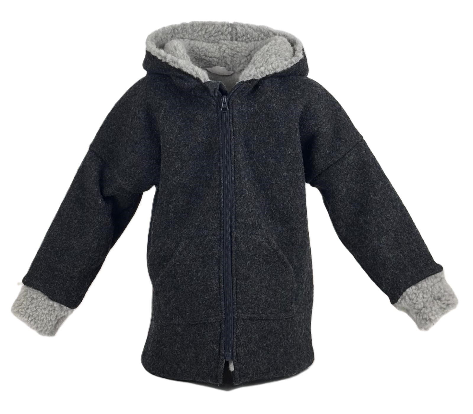 Dwuwarstwowa kurtka wełniana z kapturem w rozmiarze 116 cm, która idealnie łączy styl, komfort i troskę o środowisko.