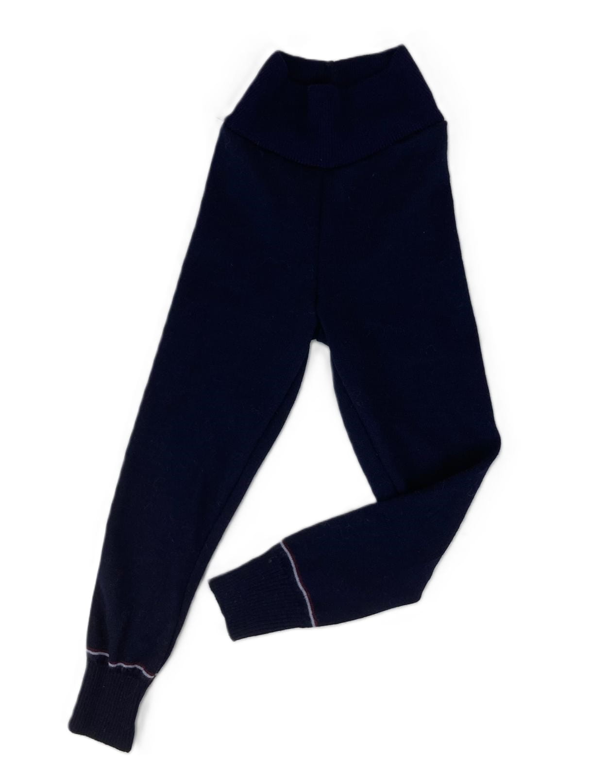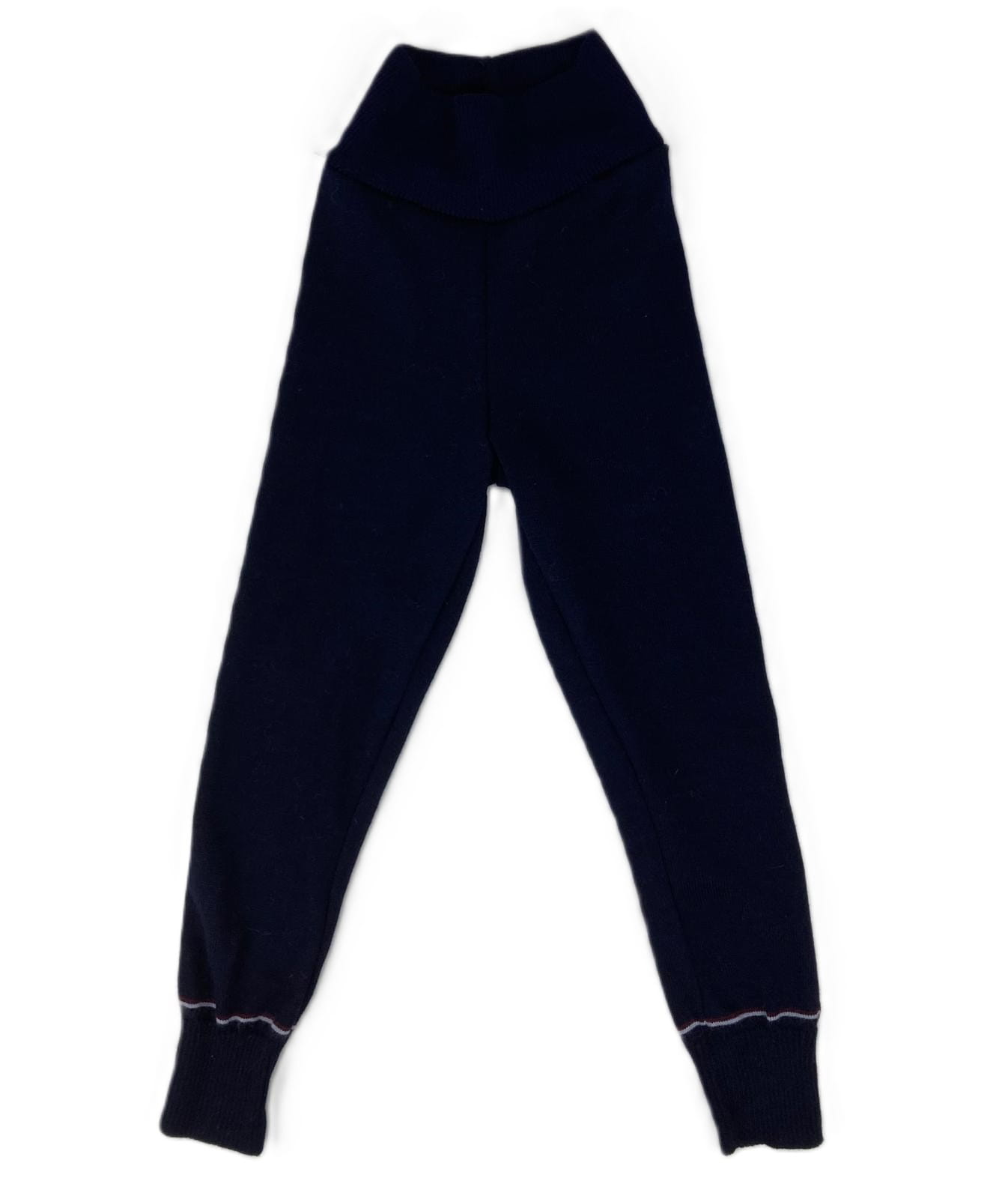 Granatowe spodnie dziecięce uszyte w duchu zero waste z używanych swetrów 100% wełna, starannie pranych przed szyciem. To idealny wybór na chłodniejsze dni, który łączy ekologiczne podejście z najwyższą jakością.