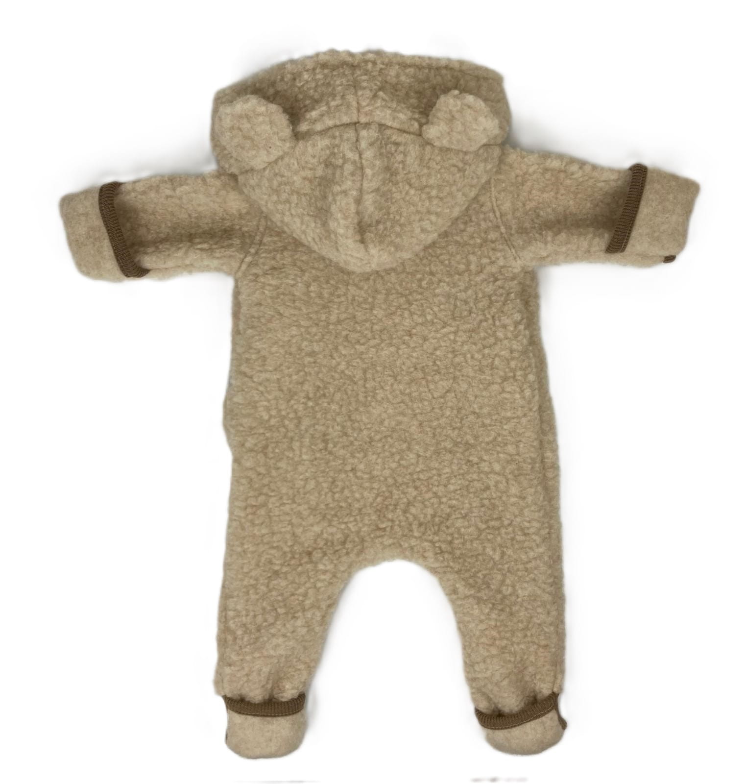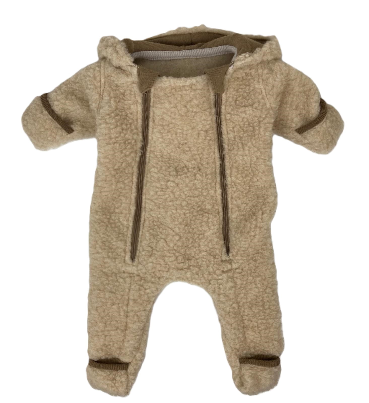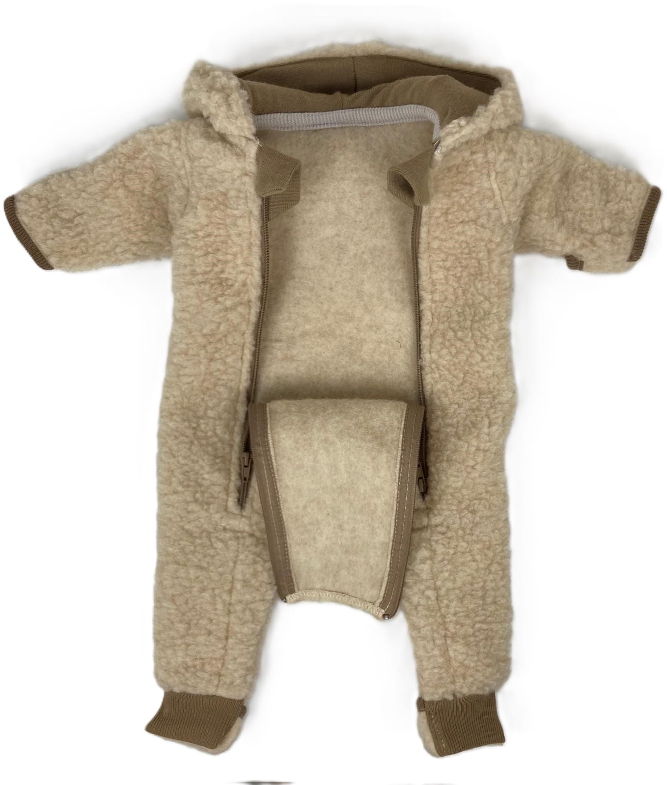 Jednowarstwowy wełniany kombinezon dziecięcy w rozmiarze 62/68 cm, wykonany z grubej i ciepłej, najwyższej jakości wełny baranek, idealny na każdą porę roku. Kombinezon w kolorze beżowym, z praktycznym kapturem podszytym wełną, to doskonały wybór dla maluszków, zapewniający ciepło i wygodę podczas codziennych spacerów oraz zabaw na świeżym powietrzu.