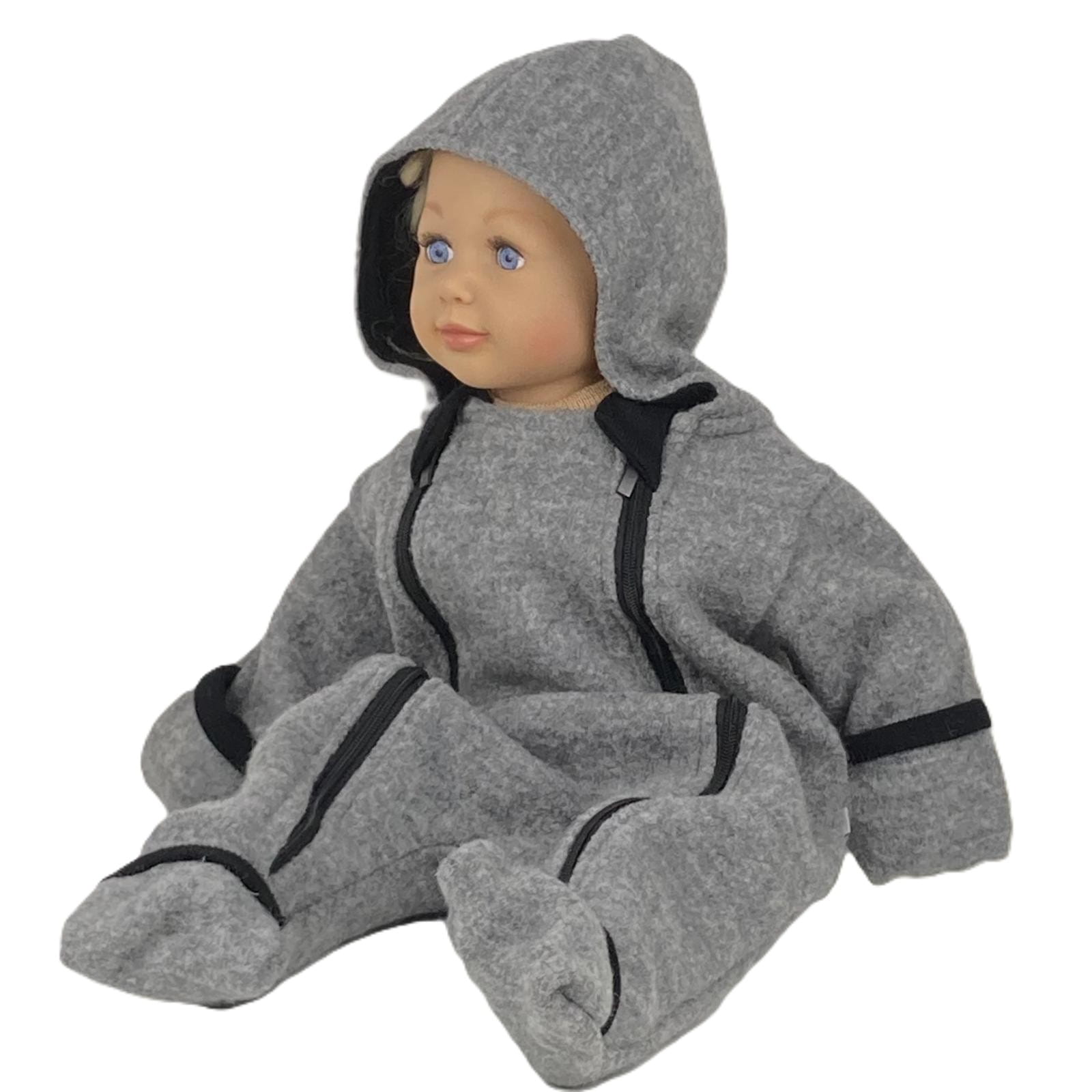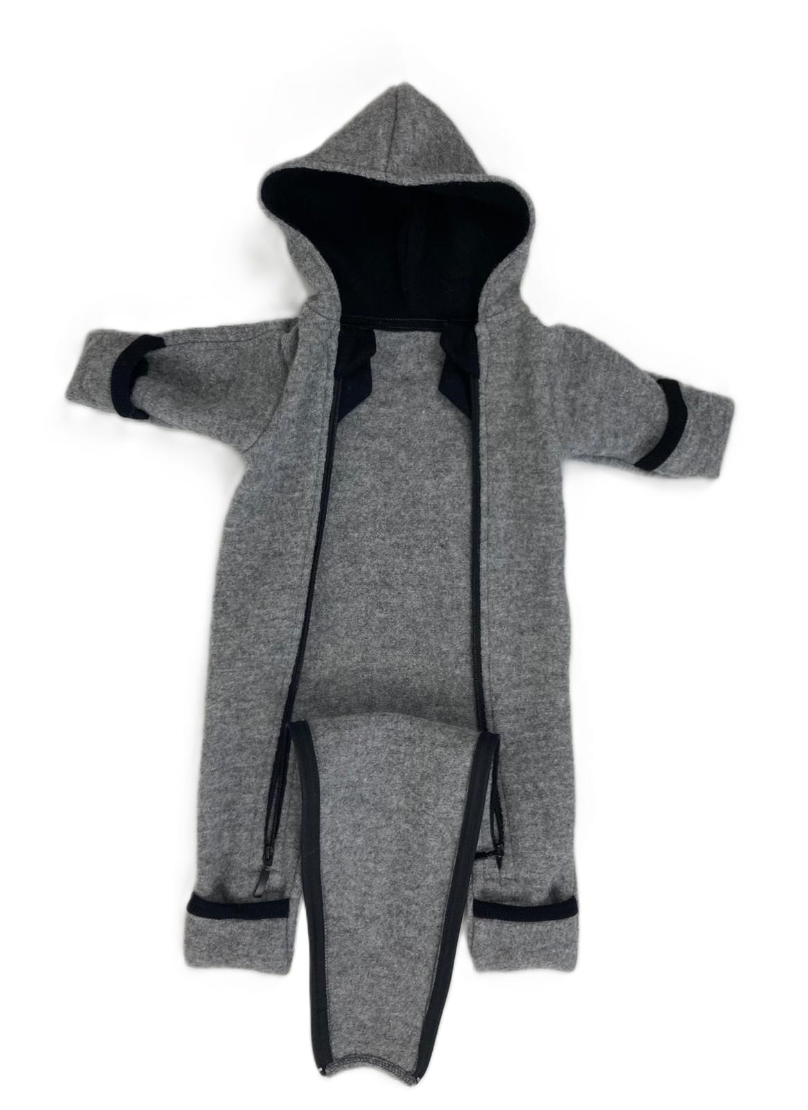 Jednowarstwowy wełniany kombinezon dziecięcy w rozmiarze 62/68 cm, wykonany z najwyższej jakości wełny parzonej, idealny na każdą porę roku. Kombinezon w kolorze szarym, z praktycznym kapturem podszytym wełną, to doskonały wybór dla maluszków, zapewniający ciepło i wygodę podczas codziennych spacerów oraz zabaw na świeżym powietrzu.
