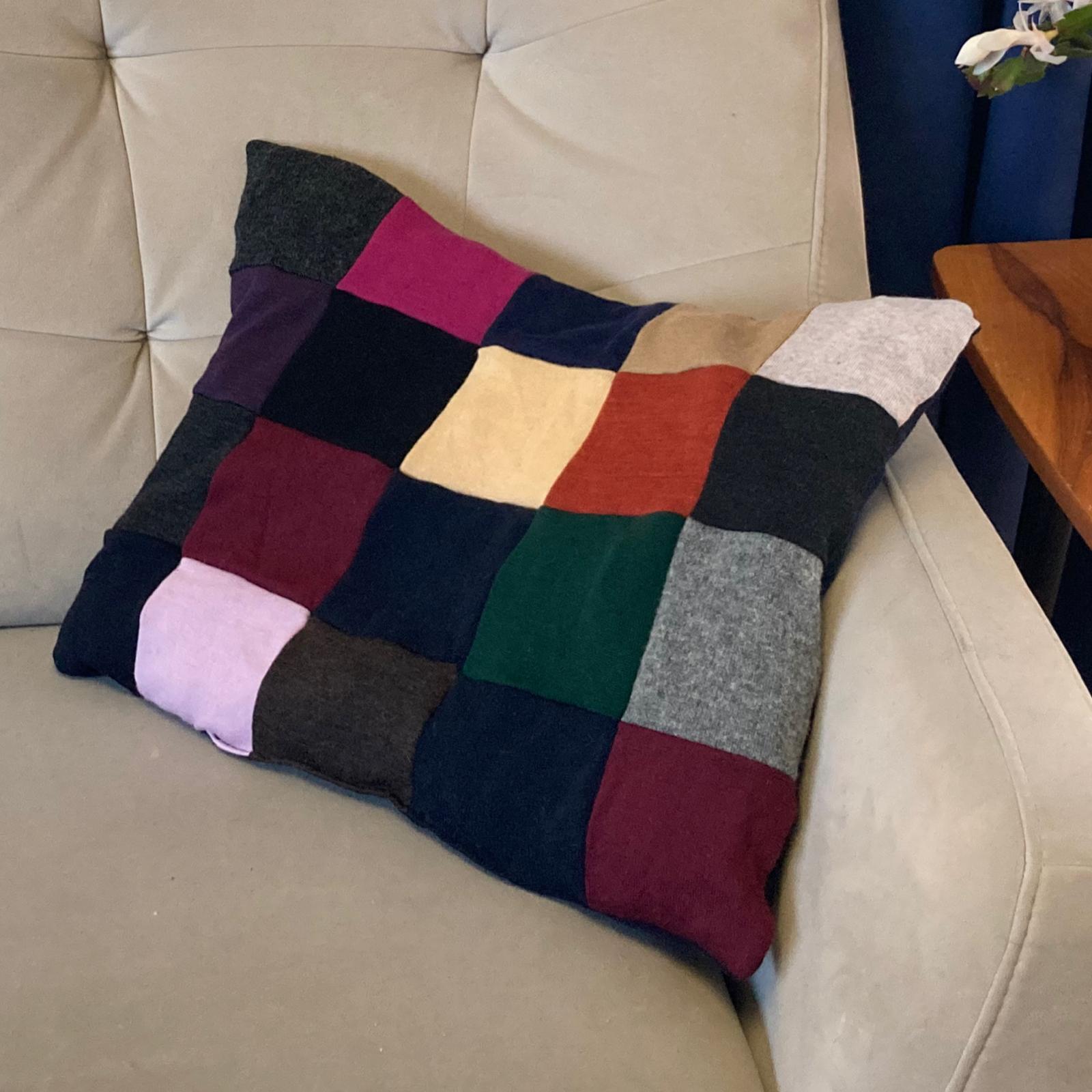 Ręcznie szyta poduszka patchwork z naturalnej wełny – każda inna